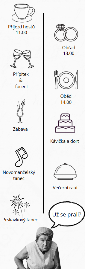 23 listopadu, 20242 června, 2025Detaily Veselka Harmonogram Náš časová plán není jízdní řád Shinkanzenu, ale spíš připomíná České Dráhy 🙂 Během obřadu nechte prosím svoje kamery vypnuté. Náši fotografové a kameraman se o vše postarají. 331 total views, 2 views today